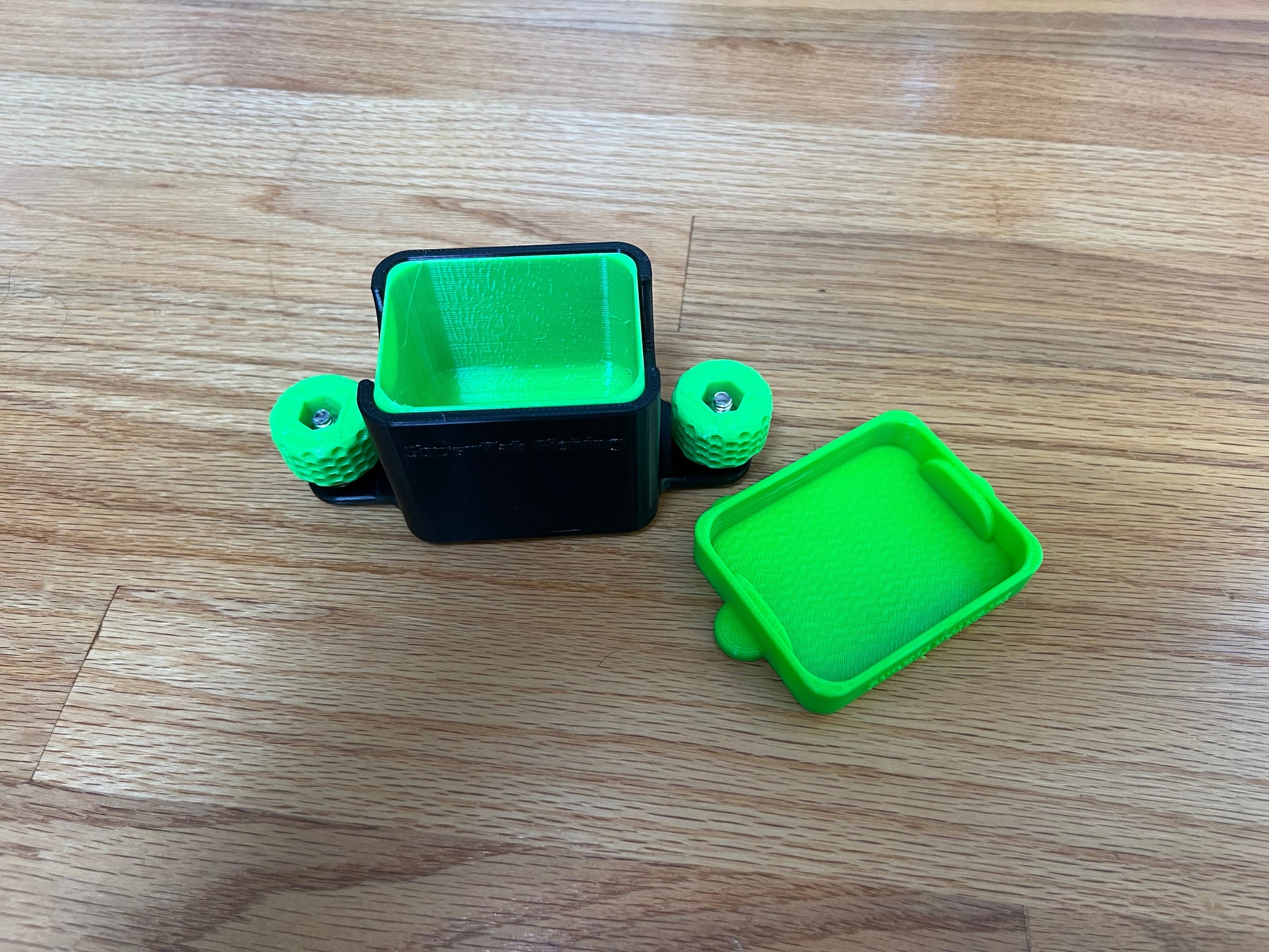 Comes with a removable internal bin (dishwasher safe top shelf) and a lid to keep your bait secure on the water. Has a lanyard attachment point on the lid so you don't loose it overboard.
